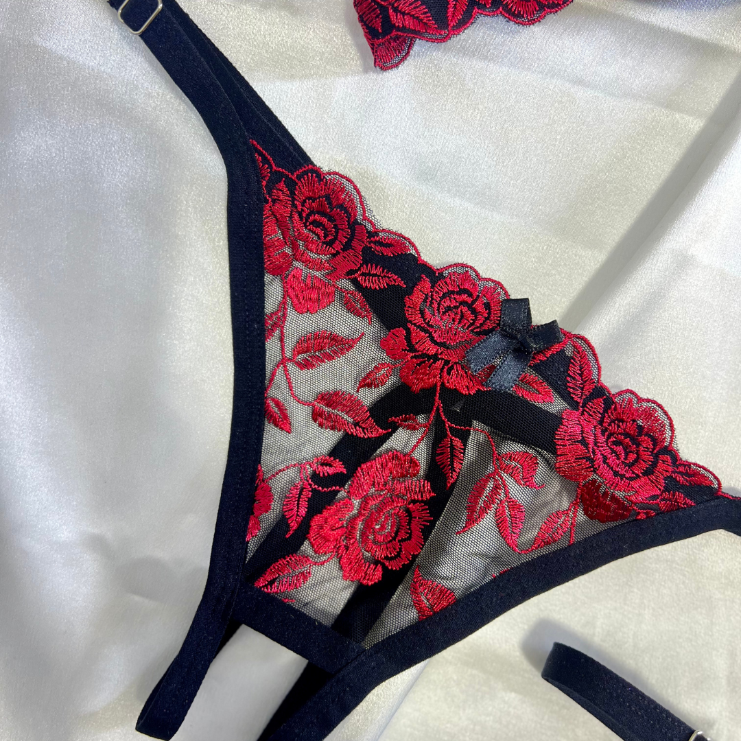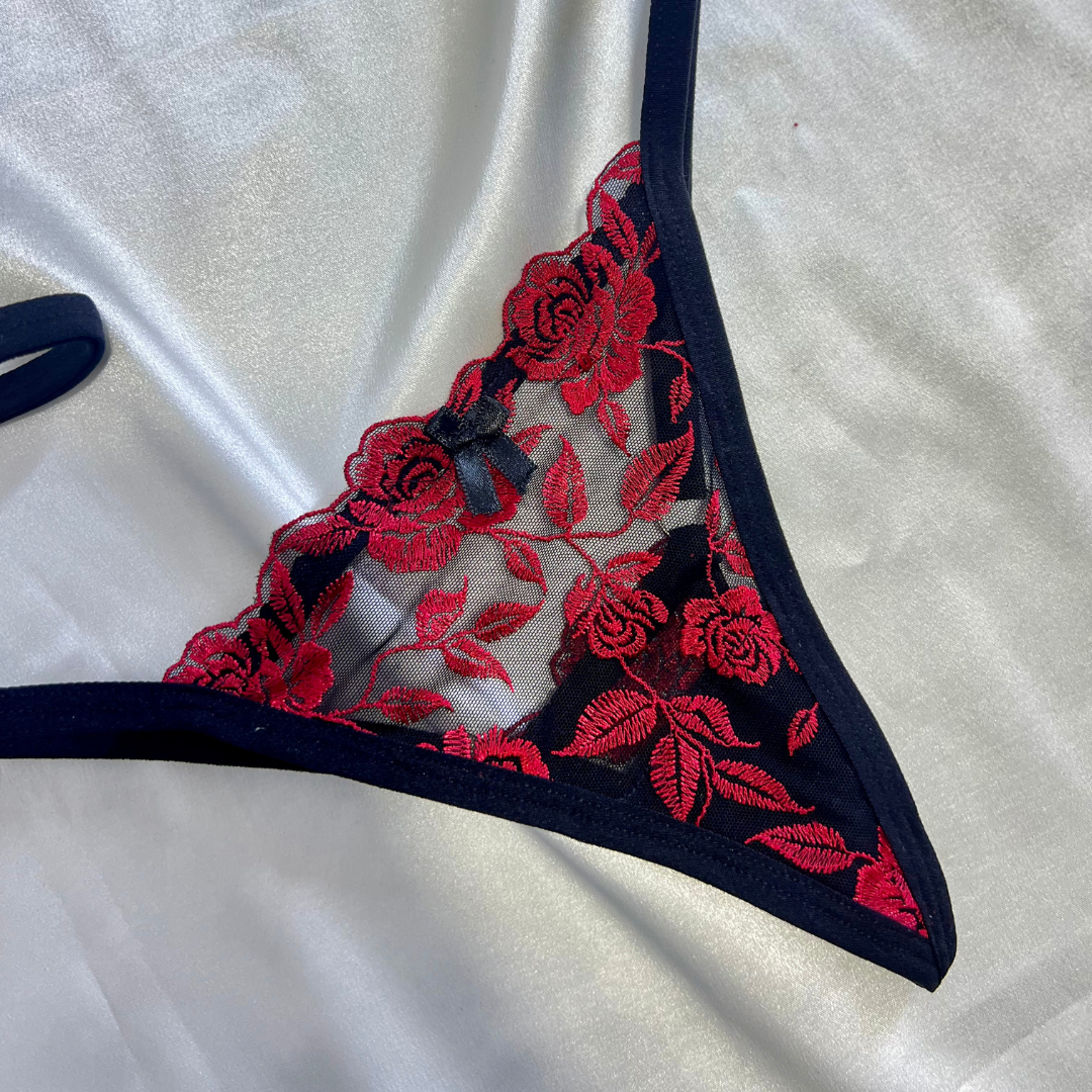 Tres piezas: balconette, hilo y una sugerente abertura.